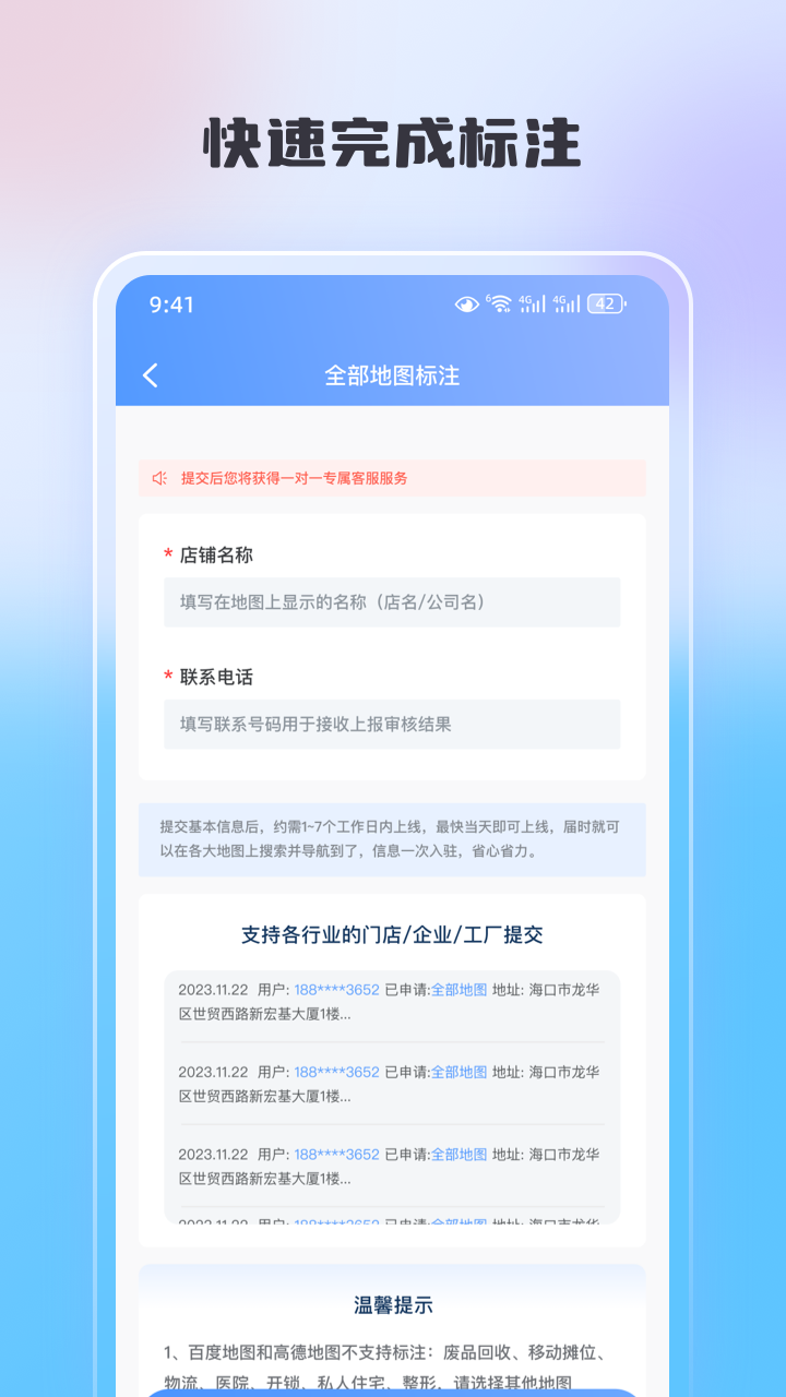 地圖標(biāo)注管家,提供代標(biāo)注服務(wù),微信地圖標(biāo)注 店鋪名稱,讓客戶快速找到您的店,標(biāo)注公司位置企業(yè)名片,微信地圖標(biāo)注.支持全部熱門導(dǎo)航地圖標(biāo)注快速申請(qǐng)標(biāo)注,全地圖標(biāo)注